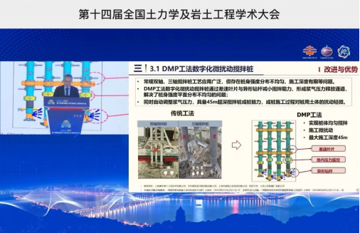 同济大学叶观宝教授在大会做题为《数字化微扰动搅拌桩(DMP工法)技术与应用》的报告,详细介绍了DMP工法的技术创新点以及在上海浦东机场四期改扩建、东方枢纽等重特大工程中的应用,DMP工法以绿色低碳、技术创新、数字化、微扰动等为特点,高度契合大会主题。