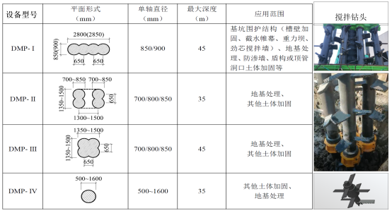 DMP工法首创了浆气同轴的三通道异形钻杆,每根钻杆内部同时包含两个喷浆管和一个喷气管,搅拌过程中均能同时喷射水泥浆液和压缩空气,压缩空气的介入有效提高了土体和水泥浆液的搅拌均匀性以及水泥土的早期强度;搅拌钻头配置7层可变角度的搅拌叶片,单点土体搅拌次数可达50次,使土体与固化剂搅拌更加充分,叶片角度在10°~35°之间调节;可一杆到底施工45m深搅拌桩,并能实现施工过程中的桩身垂直度检测。